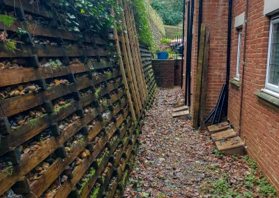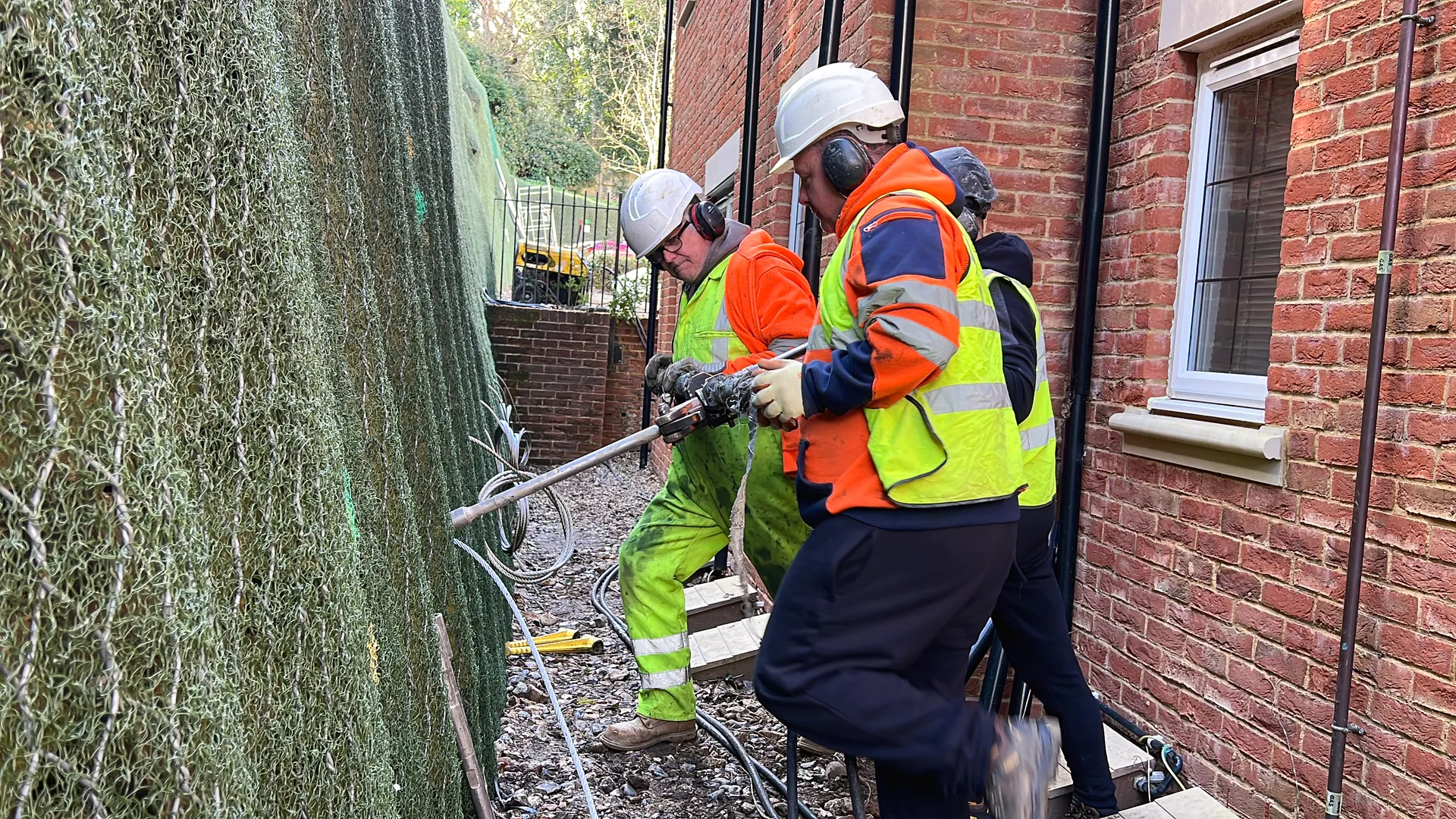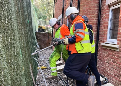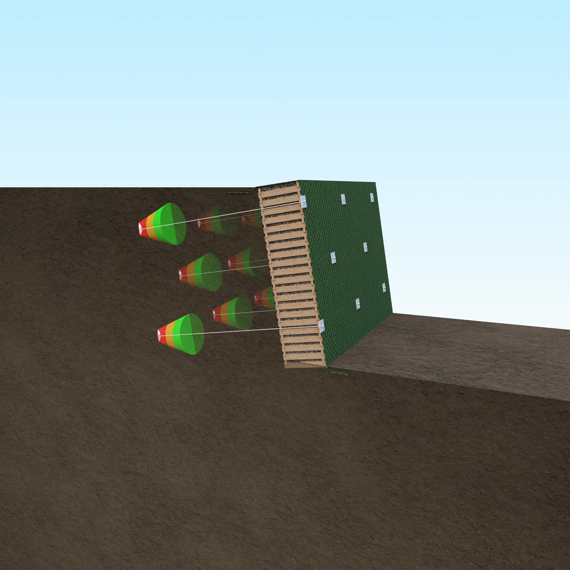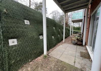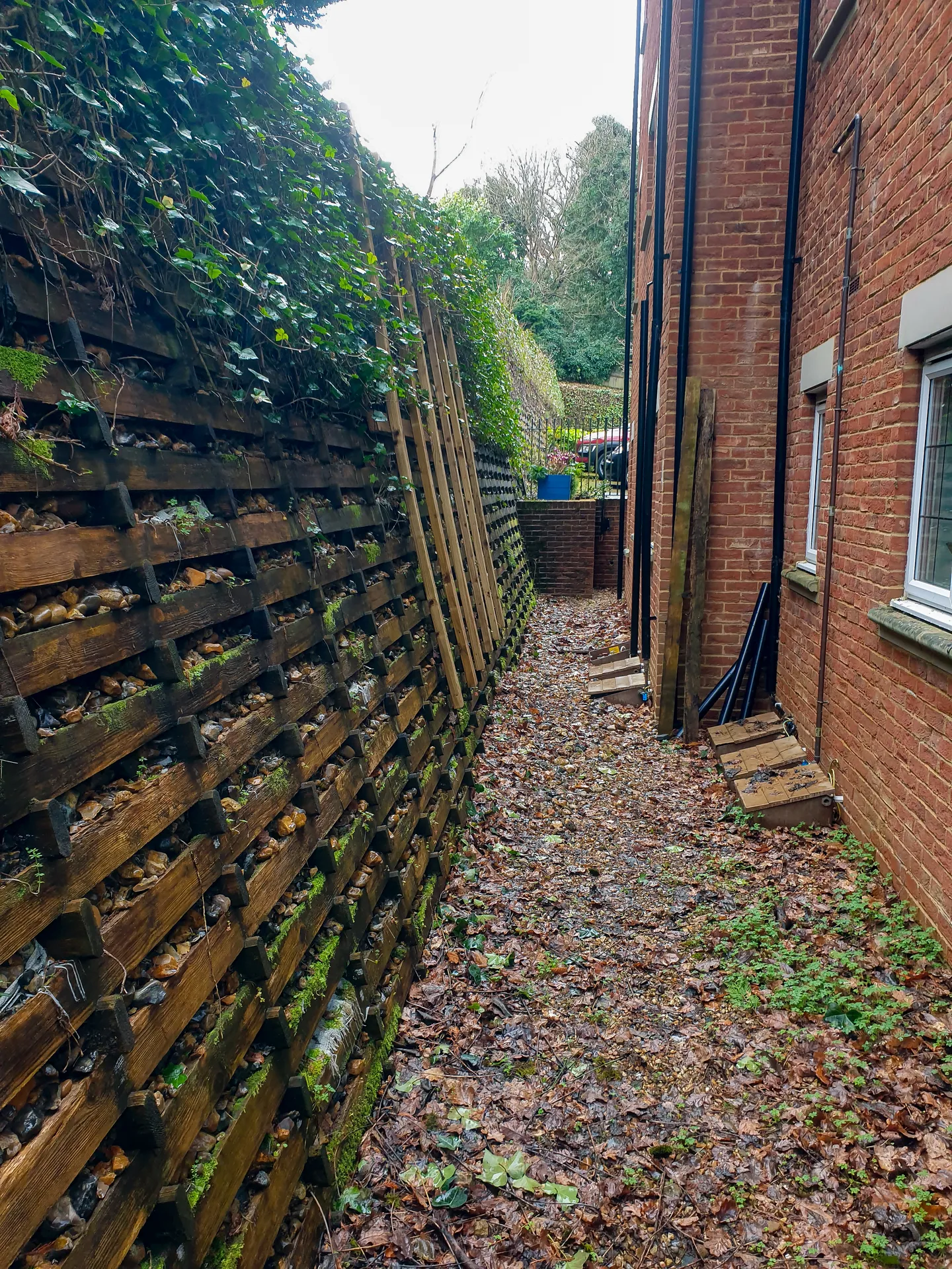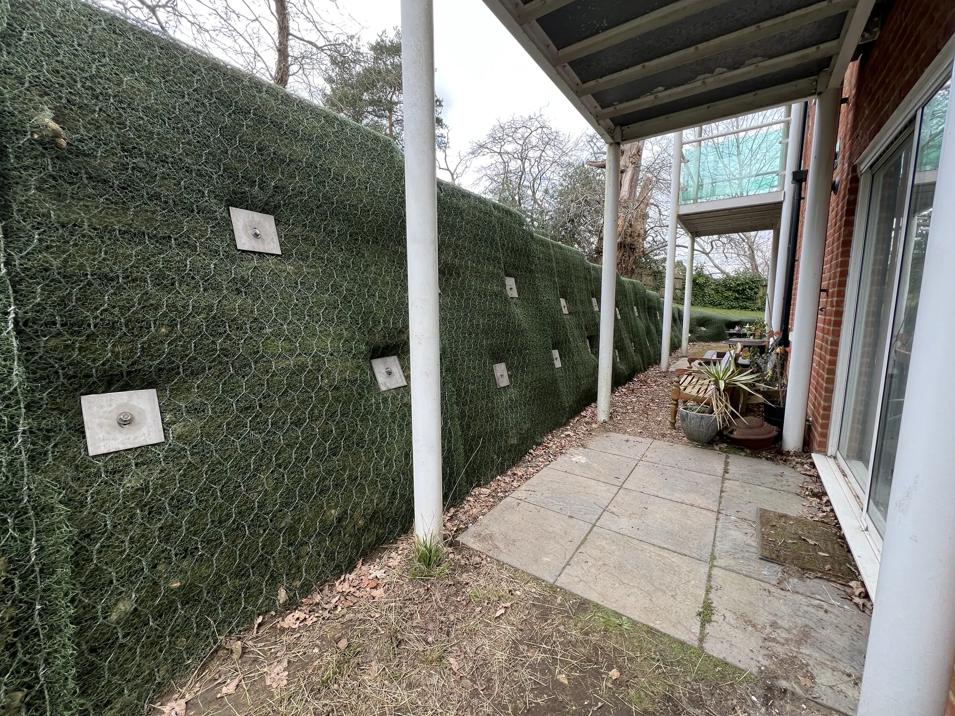 This timber crib wall, built in 2007, had failed prematurely, with some areas showing full saturation, and other areas experiencing fungal growth leading to structural decay. This meant timber elements were approaching or had reached the end of their lifespan, with localised failures having already occurred. The structure, constructed from pine and backfilled with aggregate, varied in height from 0.3m to 5m tall, with a linear extent of 124m, requiring anchoring. Replacement of localised failures would not prove cost-effective or meaningfully increase the lifespan of the wall, and rebuilding with traditional masonry would be prohibitively expensive. Due to site boundary lines, all anchor drive depths would be limited to stay within these whilst providing suitable performance.