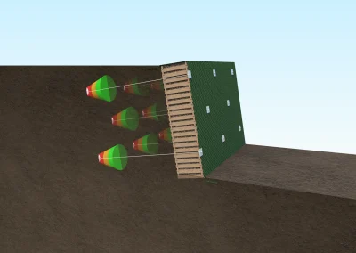 Anchor suitability tests were conducted behind the wall at the distance and depth where anchors would be driven, allowing the Platipus Geotechnical Team to devise a suitable anchoring scheme. As a cost-effective solution, a reinforced geomat was laid over the face of the structure to distribute the load and prevent significant deformation of the timber crib wall. 222 Platipus Stealth anchors were driven through the structure and loadlocked at working loads between 5kN and 39kN. Where the height did not exceed 1m only one row of anchors was specified, for heights between 1m and 3m two rows were specified, and for sections greater than 3m high, three rows of anchors were specified. Some parts of the wall presented limited access with adjacent buildings nearby, to overcome this, anchors were driven using a combination of handheld machinery, tracked excavator, and Brokk machine. This provided a cost-effective permanent solution to mitigate the failure of this timber crib wall.