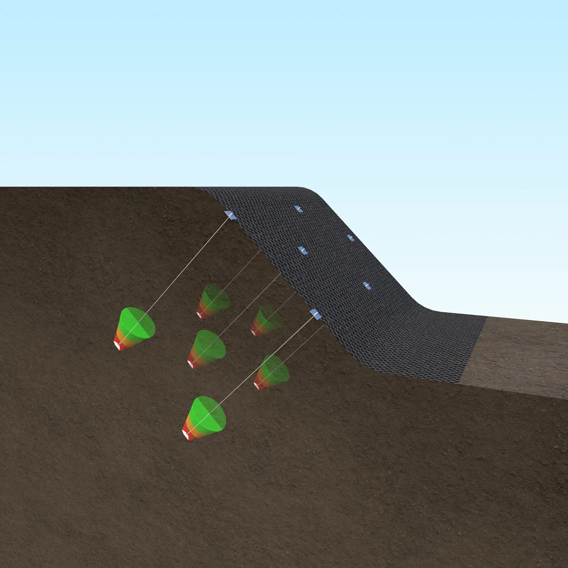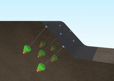 After clearing the thick vegetation, vertical anchor tests were conducted at the slope’s crest, confirming that the theoretical anchor performance matched the design specifications. The slope was excavated then draped with an erosion control matting and double twist mesh which would support the loads applied by the Platipus S6 and S8 anchor systems. A top-down construction method was used with anchors then installed to 3m and 5m deep and spaced 1.2m apart both horizontally and vertically. The project required only a single lane closure, minimising disruption. The available space was sufficient to complete the installation with a 3.5t excavator and a team of three operatives. A total of 924 anchors were successfully installed over a 10-week period, which then allowed for construction of sidewalks to commence. Finally the slope will be planted with ground cover plants as a natural erosion prevention.