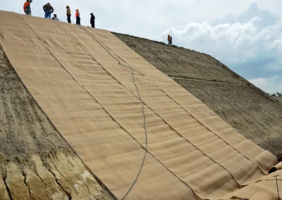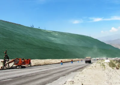 The cut slopes were first protected with 2 layers of erosion control materials. The first provided the erosion protection and kept the surface soil from sliding down the slope. The top layer provided the strength to handle the load generated by the Percussive Driven Earth Anchor (PDEA®) as well as UV protection.